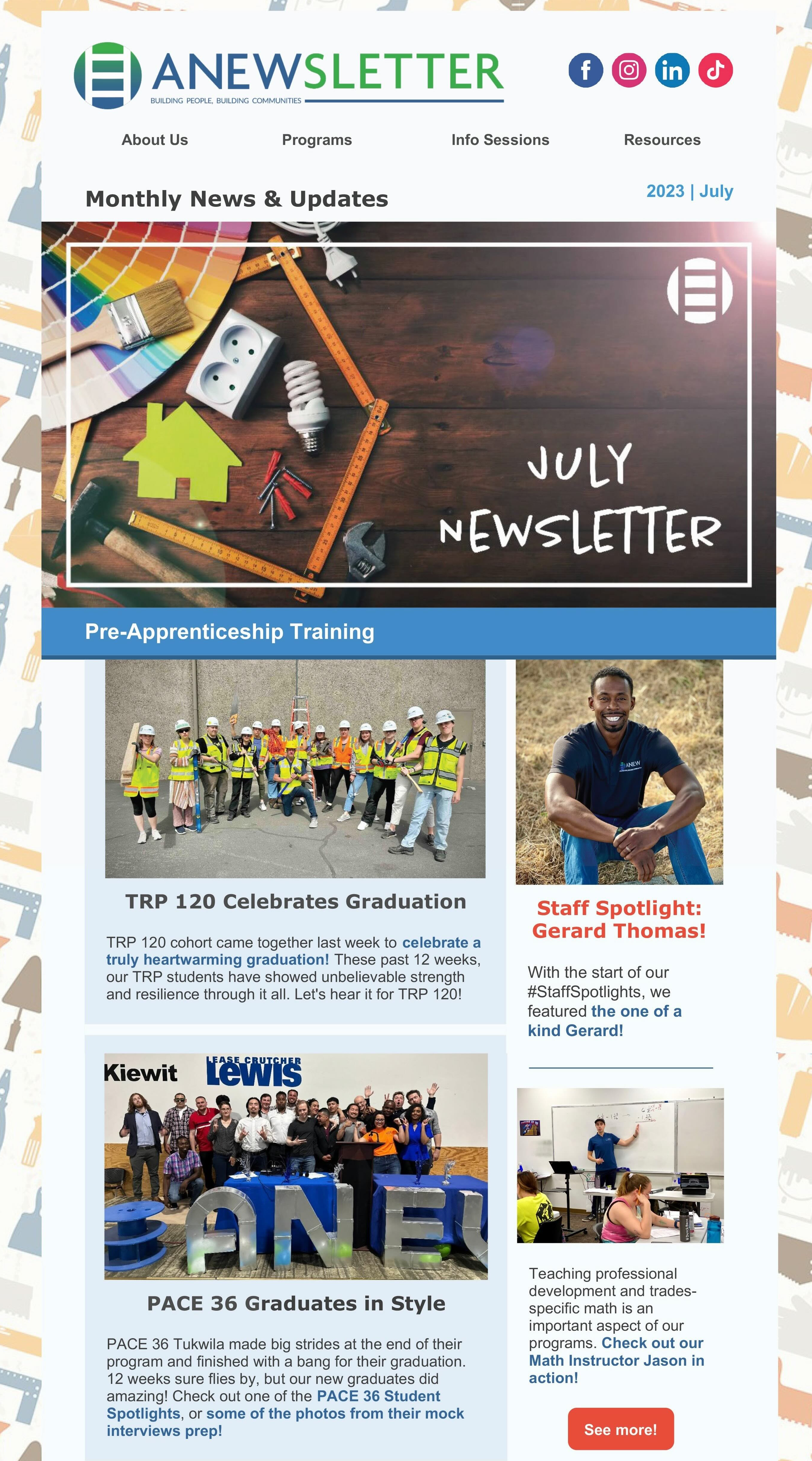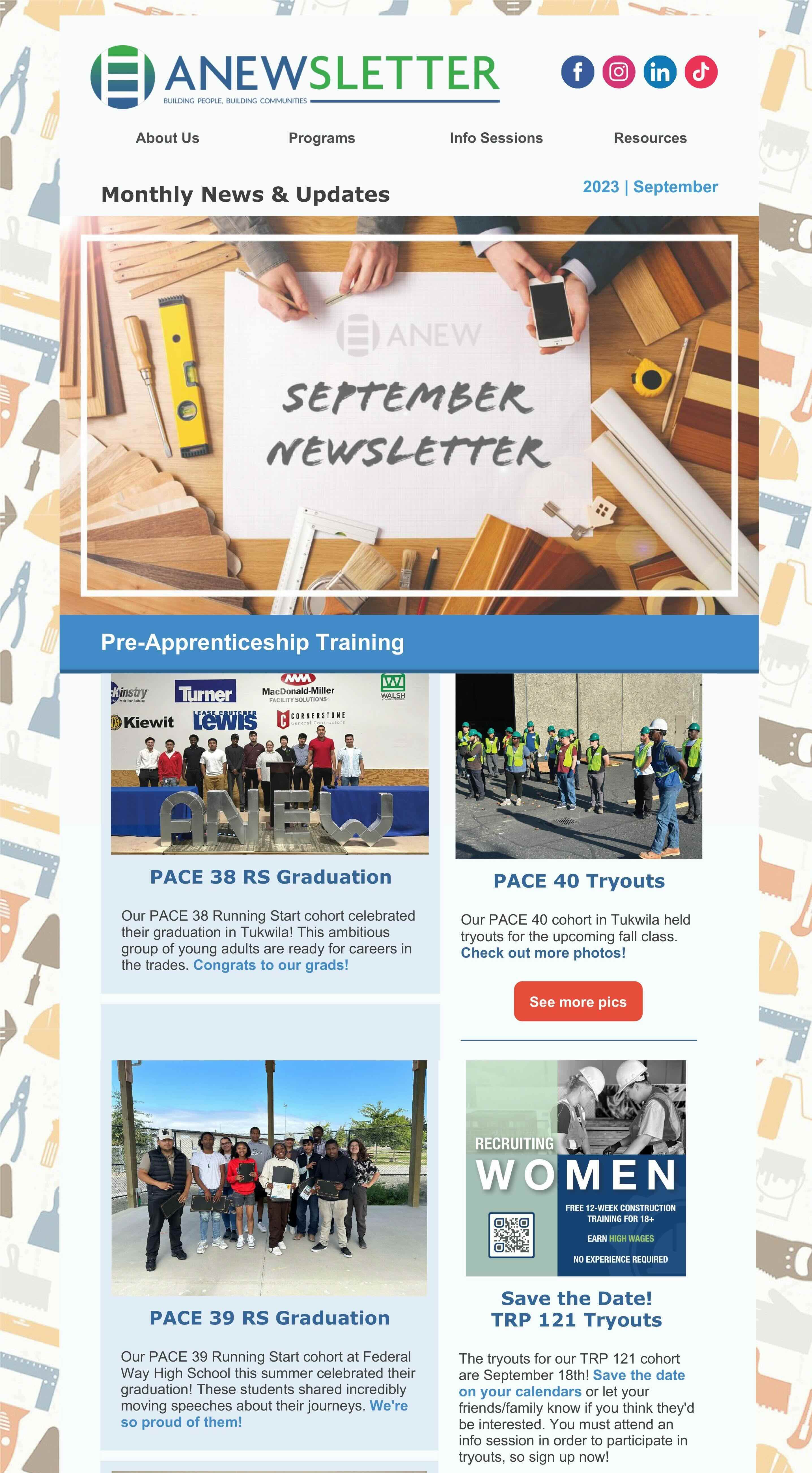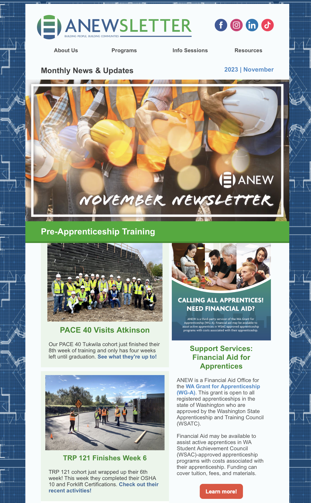 newsletters designed, developed, and written for ANEW’s clients, sponsors, donors, students, alumni, and lead generation