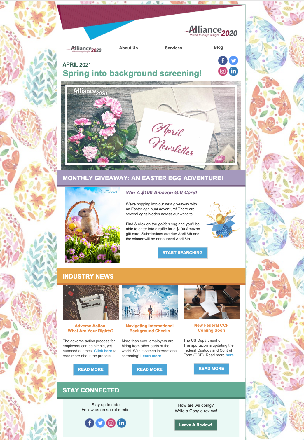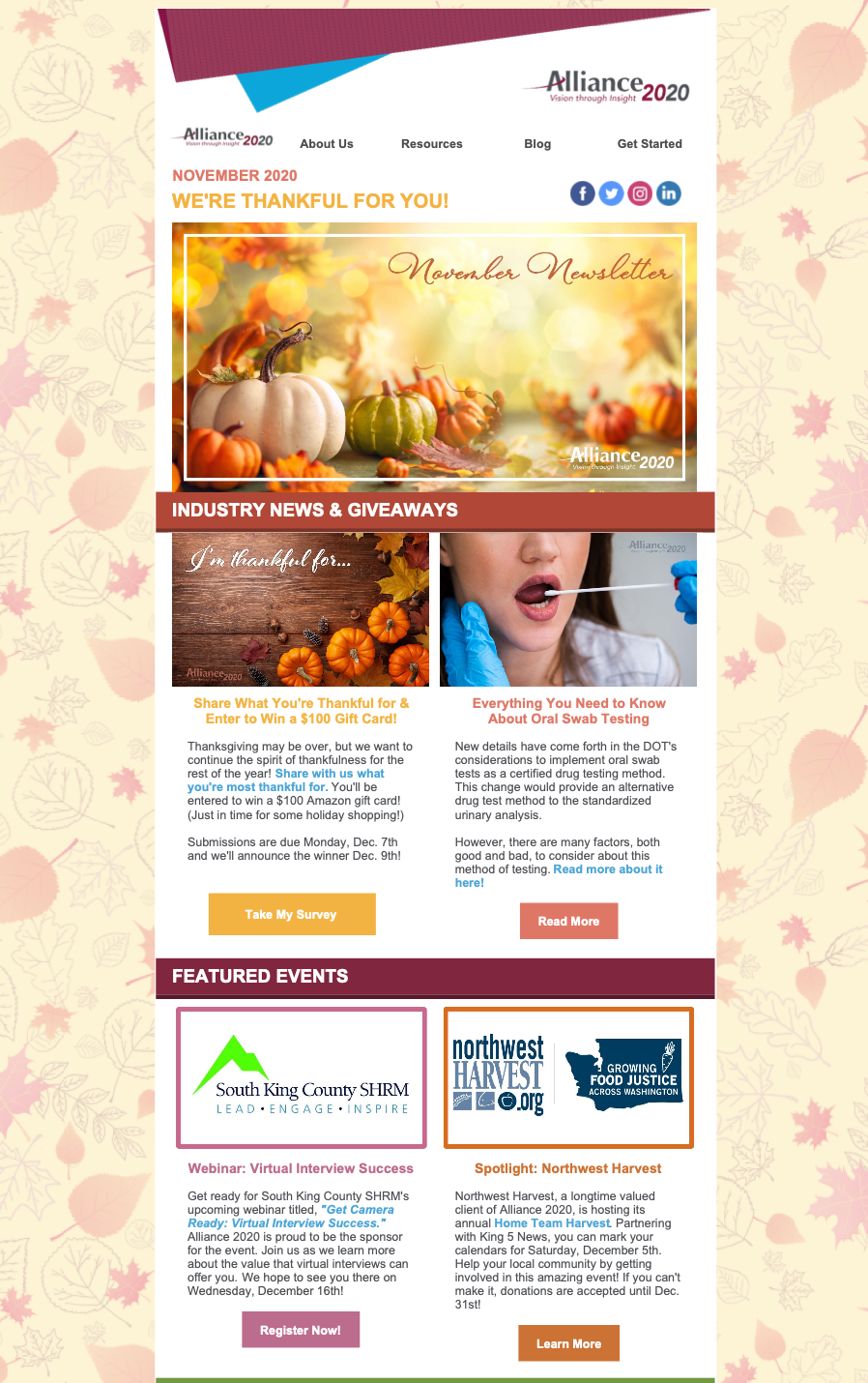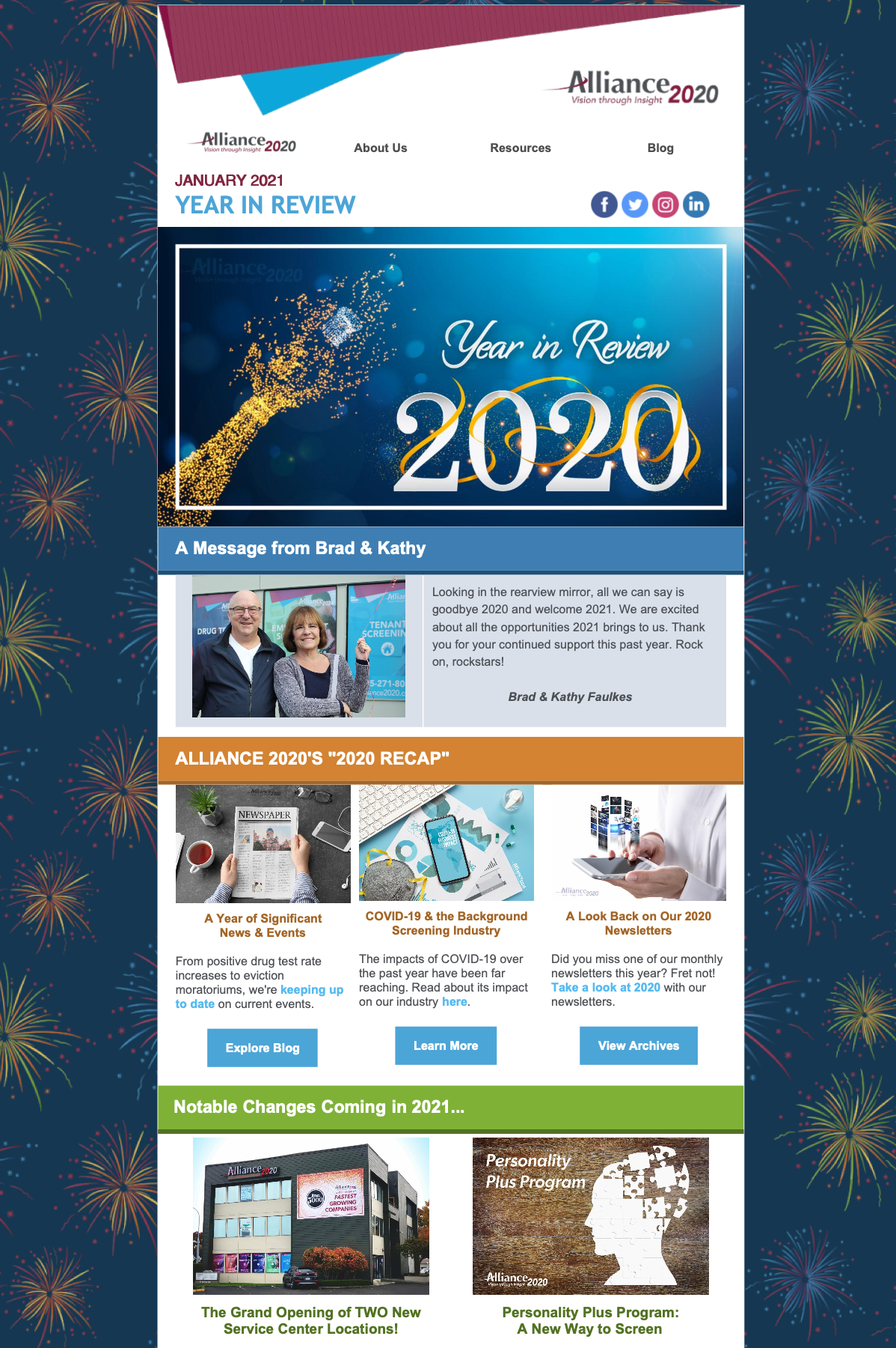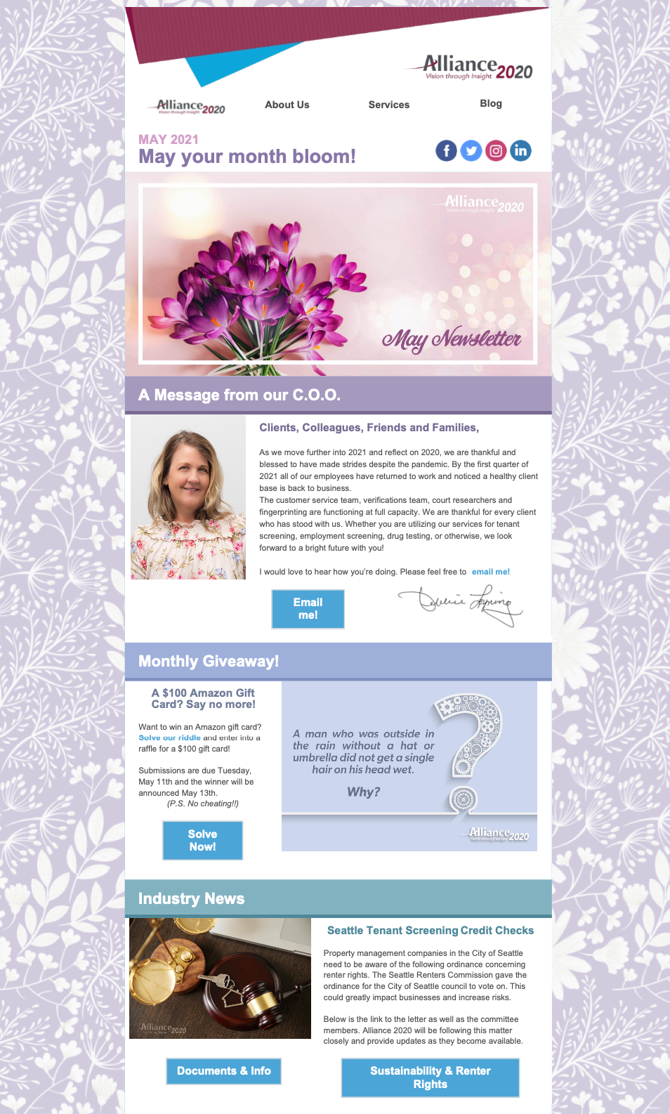just a a few examples of the dozens of newsletters created, designed, written, and produced while I served as the Marketing Director for Alliance 2020. Massively popular and successful, clients and leads alike consistently shared positive feedback, going as far as to elucidate that they looked forward to each month’s newsletter. I often received praise for the engaging activities, interesting content and articles, and vibrant use of colors.