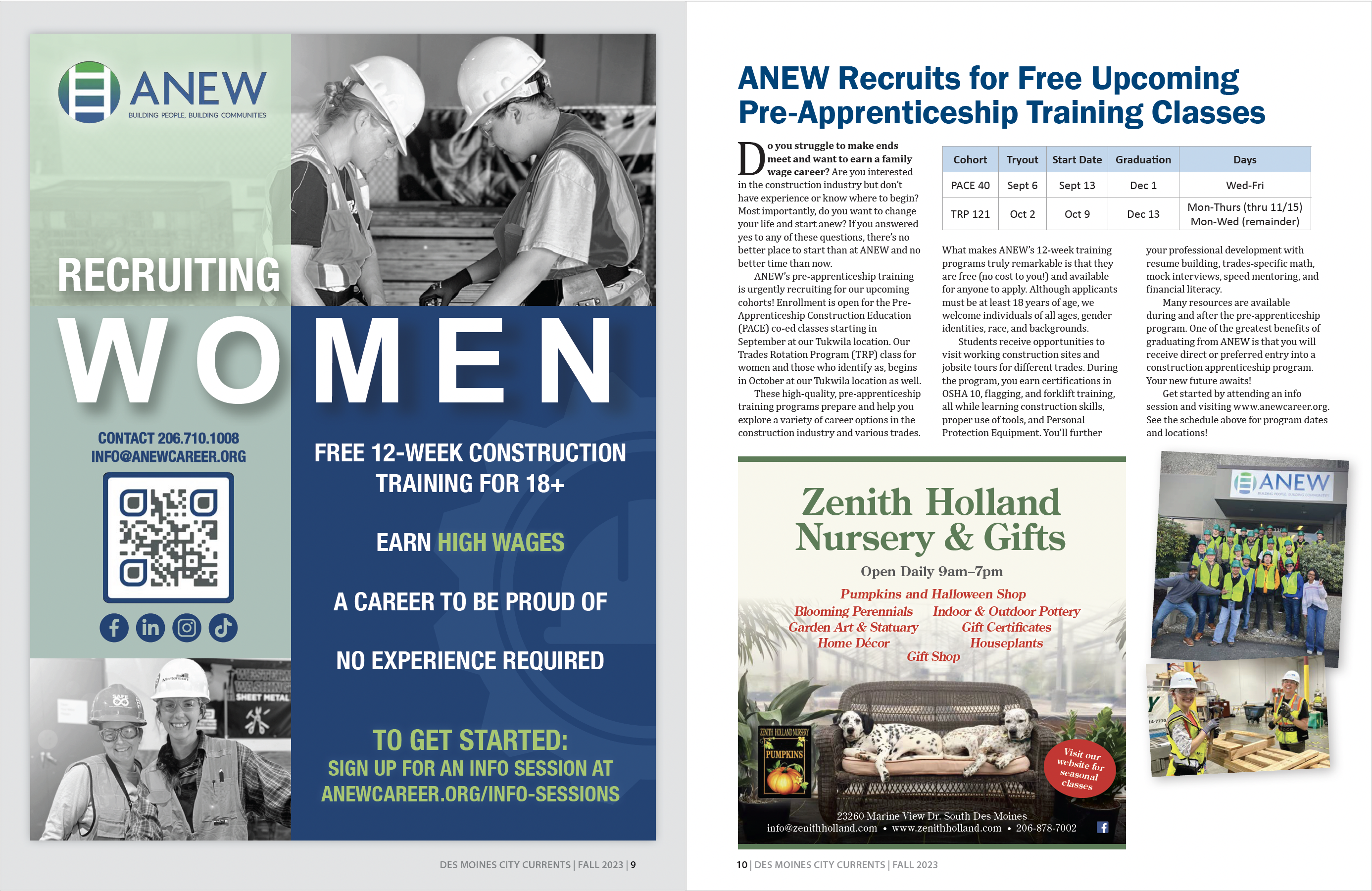 A press article on pages 9-10 featuring ANEW’s Training Program